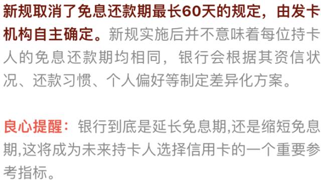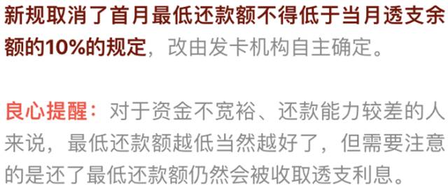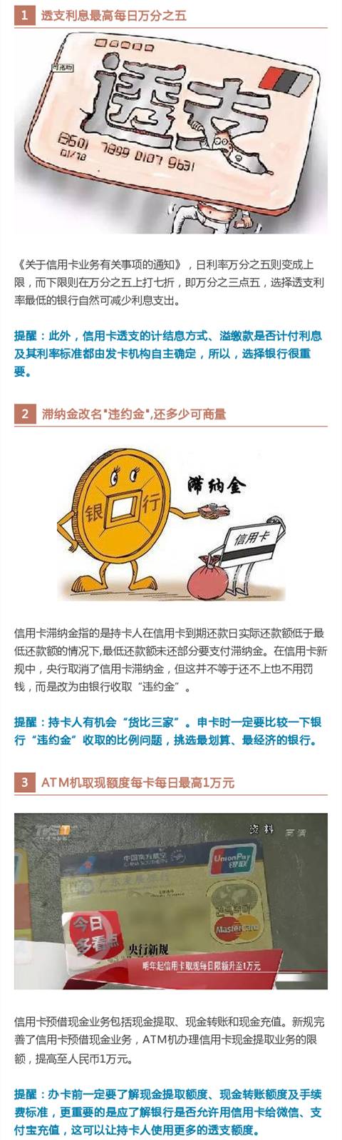 根据《中国人民银行关于信用卡业务有关事项的通知》,央行取消现行统一规定的信用卡透支利率标准,实行透支利率上限、下限区间管理;取消透支消费免息还款期最长期限、最低还款额标准及附加条件现行规定;取消滞纳金,由发卡机构和持卡人约定违约金;ATM预借现金提现限额从原来的每卡每日累计取现2000元提高至1万元。